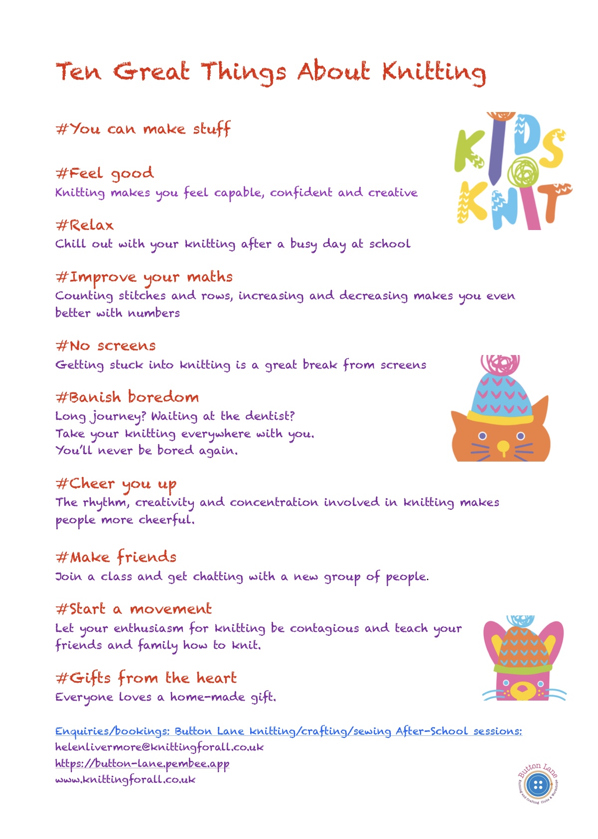 Knitting encourages creativity, increases ability to concentrate, is beneficial to maths skills and provides relaxation in a hectic day.